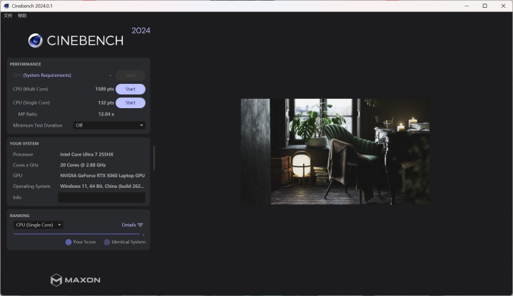再次是Cinebench 2024的测试,实测酷睿Ultra 7 255HX的多核成绩为1589pts、单核成绩为132pts,表现与之前的测试基本一致,既单核性能给力,多核性能处于中高水平。