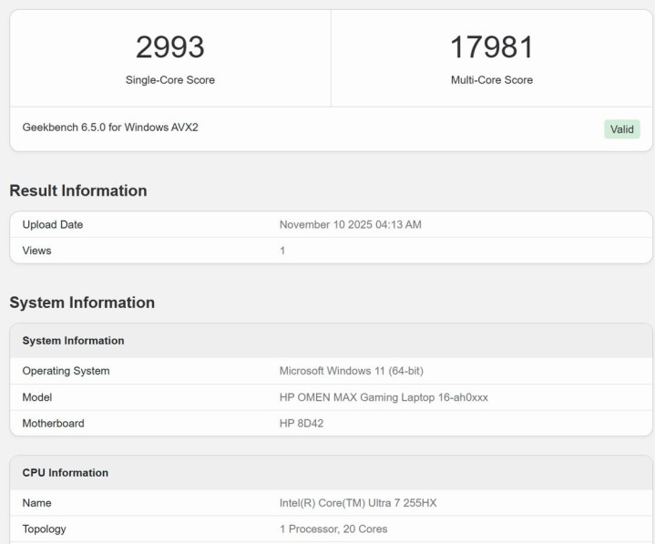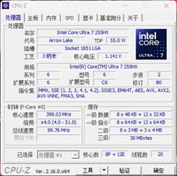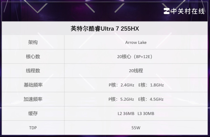 先看规格。酷睿Ultra 7 255HX采用Arrow Lake架构,拥有20核心20线程,包含8个性能核和12个能效核。其中性能核基础频率2.4GHz,最大睿频5.2GHz,能效核基础频率1.8GHz,最大睿频4.5GHz。二级缓存为36MB,三级缓存为30MB。基础功耗55W,最大睿频功耗160W。