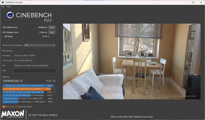其次是Cinebench R23的测试,实测酷睿Ultra 7 255HX的多核成绩为28368pts、单核成绩为2166pts,性能表现同样比较给力。单核性能的表现依旧非常给力,多核性能属于目前移动平台的中高端水平,与上一代的i9-14900HX基本处于同一水平,