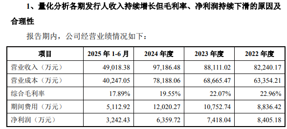 长鹰硬科在回复中就上述问题做出了详细解析,公司表示,2022 年-2024 年,公司收入持续增长,但由于国内外经济环境的变化,市场竞争加剧,公司上游原料碳化钨粉末价格上涨,人员薪酬支出的增长,导致公司整体毛利率下滑,加之销售费用、管理费用等期间费用的影响,公司净利润下降。2025 年 1-6 月,原材料碳化钨粉末价格仍呈大幅上涨态势,持续对成本端形成压力,导致毛利率进一步下滑,但得益于公司收入稳步提升和期间费用下降,净利润实现回升。综上,公司业绩变动与行业环境、公司经营实际相符,具有合理性。