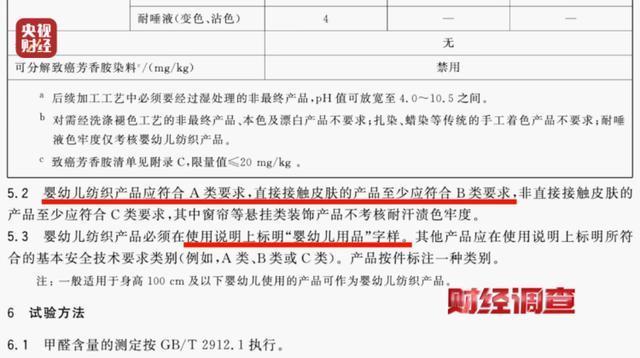 记者查阅了国家标准《GB 18401-2010 国家纺织产品基本安全技术规范》:婴幼儿纺织产品必须符合A类要求且标明“婴幼儿用品”字样,直接接触皮肤的产品至少需符合B类要求。